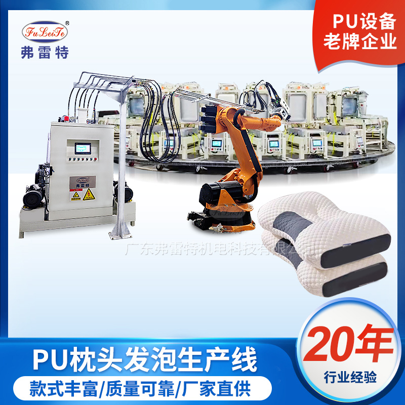 這是一套聚氨酯枕頭發泡生產線,包括一套軟泡聚氨酯高壓發泡機,一個直徑9.5米的轉盤線,可放置28個工位,一套灌注機器人和一套脫模劑機器人,實現智能自動化高效生產。團隊與客戶合作緊密,設備安裝、測試和調試順利完成,贏得客戶滿滿贊譽。