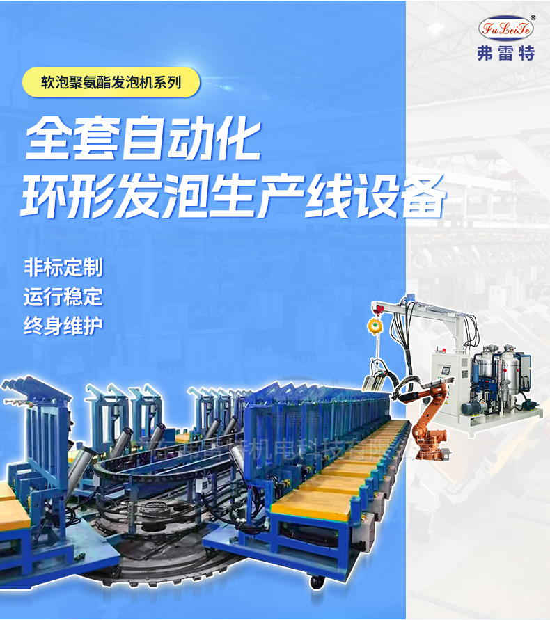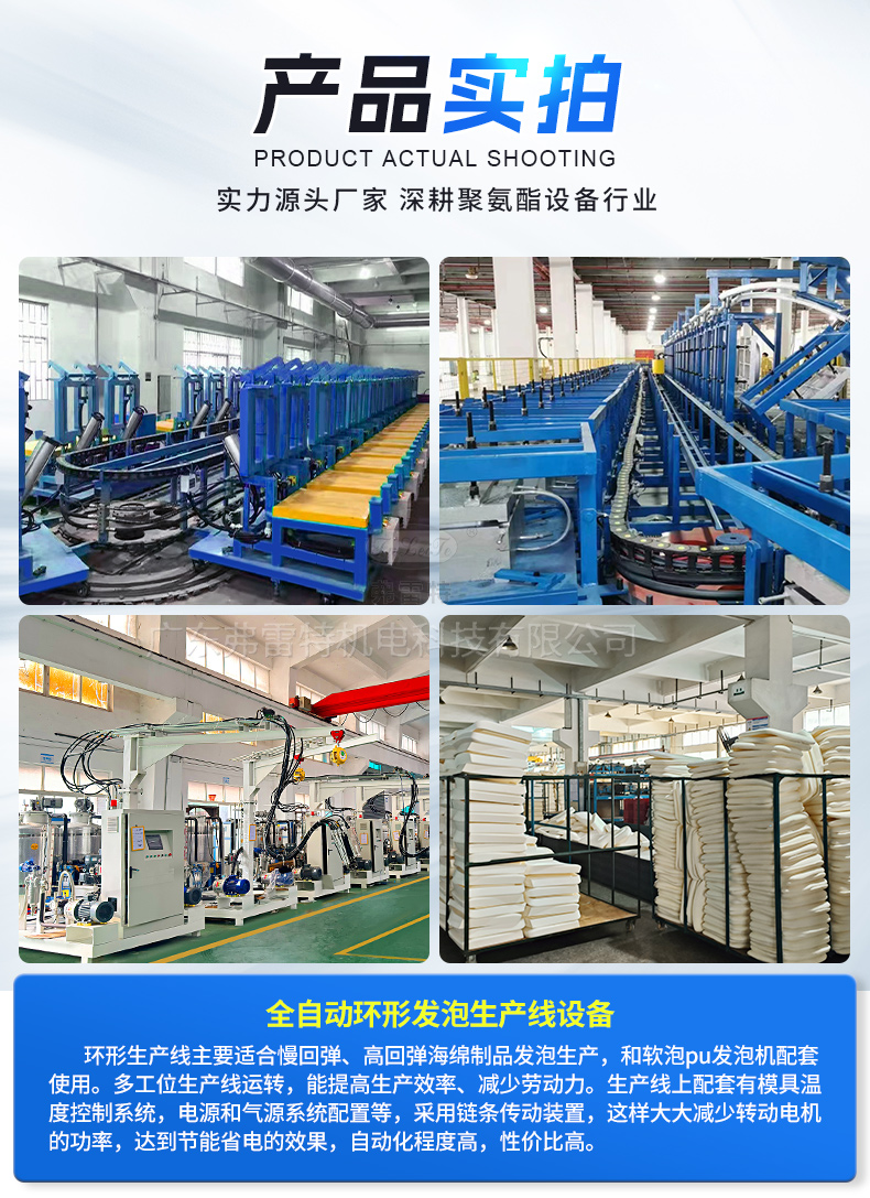 環形生產線主要適合慢回彈、高回彈海綿制品的發泡生產,是和精密發泡機配套使用的,能提高生產效率,減少勞動強度,提高產品質量。環形生產線、軟泡發泡機是生產慢回彈,高回彈發泡制品必不可少的設備。流水線上配套有模具溫度控制系統,電源和氣源系統配置等,流水線傳動采用鏈條傳動裝置,這樣大大減少轉動電機的功率,達到節能省電的效果,旋轉速度無極可調,性能穩定,自動化程度高,擁有極高的性價比。