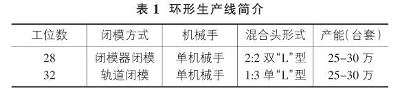 干部設(shè)備主要由模架車、閉模器、液電氣控制系統(tǒng)組成;濕部設(shè)備主要有高壓發(fā)泡機(jī)、計(jì)量系統(tǒng)、液壓站等。橢圓環(huán)形線具有工位多、換模節(jié)拍短等優(yōu)點(diǎn),目前座椅發(fā)泡工廠多采用環(huán)形生產(chǎn)線。