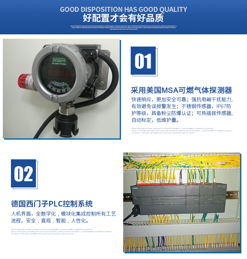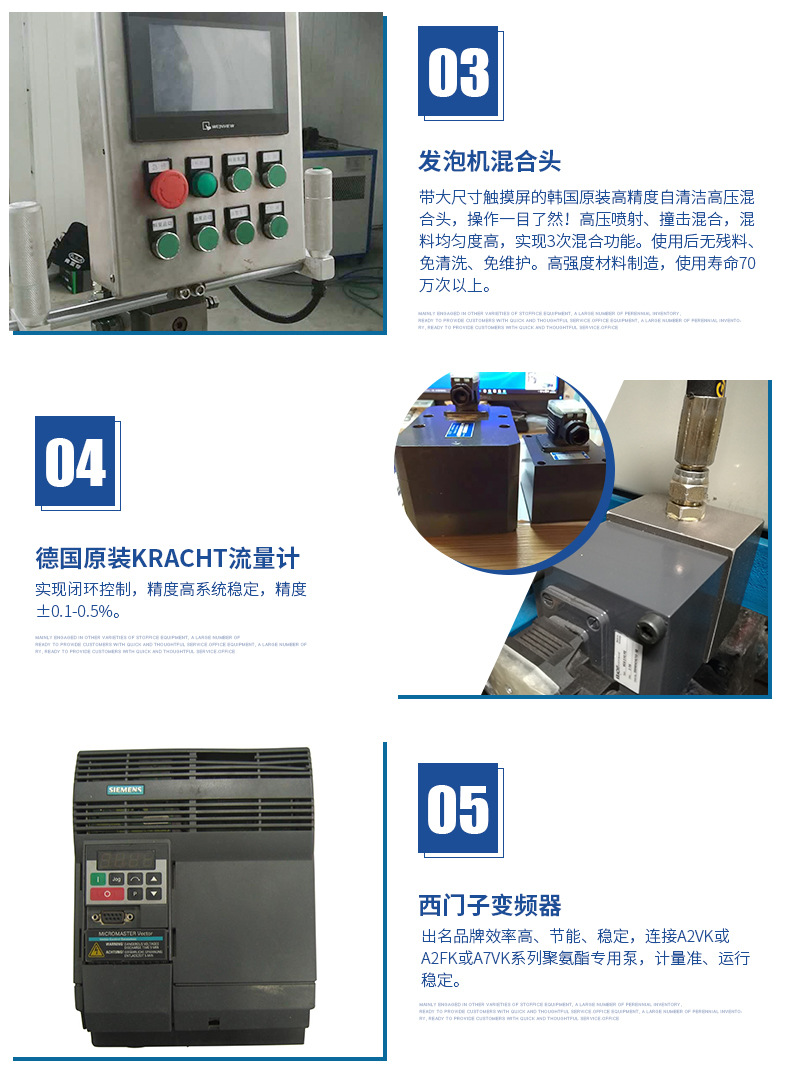 具有西門子PLC+雙變頻多功能安全裝置,38個智能自檢保護點,獨立防靜電房,烷氣濃度等級自動識別系統,自動2-3級抽風系統,西門子防爆電機,獨立導地裝置,槍頭引線靜電導出裝置等,外接2組獨立對比恒溫,12~100種噴灌定時定量控制,開槍溫度鎖定,故障自檢報警等,本系統采用自清潔/止逆/防濺粘/新型V型發泡槍(實現3次混合功能),結構美觀、操作方便。根據客戶實際情況,還可以一機雙槍使用,雙槍自動切換,變頻節能、應用自如,專為客戶量身訂做發泡完善系統。