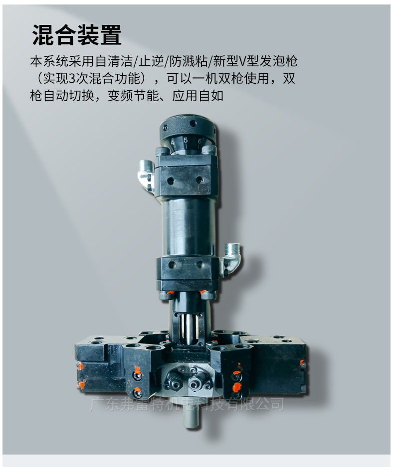 3、故障自檢預警系統: 系統可提前預警,以便及時調整相關參數,避免不良品的出現。4、混合裝置: 采用自清潔/止逆/防濺粘/新型V型(實現3次混合功能)發泡槍,結構美觀,操作方便。配合西門子聚氣醋專用泵,注射準確,混合效果好。