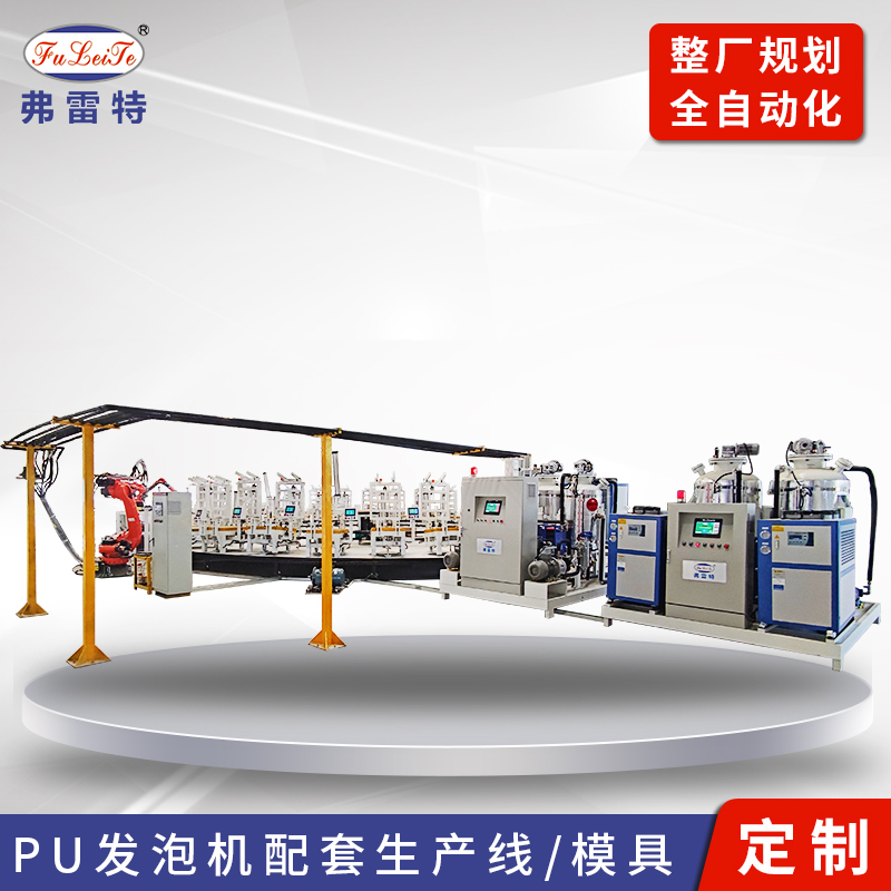 我公司自主研發的大型自動化PU轉盤發泡生產線能實現連續型、多工位、全自動化生產等主要功能,主要應用于汽車、摩托車、健身器材、座椅、腳墊等聚氨酯發泡生產。整條生產線只需要二人就可完成生產,一天24小時產能大于等于5000個產品,主要由上位工控機、掃碼讀碼系統、FLT-ZD/S型全自動控制模具模架、德國庫卡機器人、FLT-12G可變比例的聚氨酯高壓發泡機、FLT-12M預混站、FLT-ZK-PP/T真空破泡機等主要設備組成: